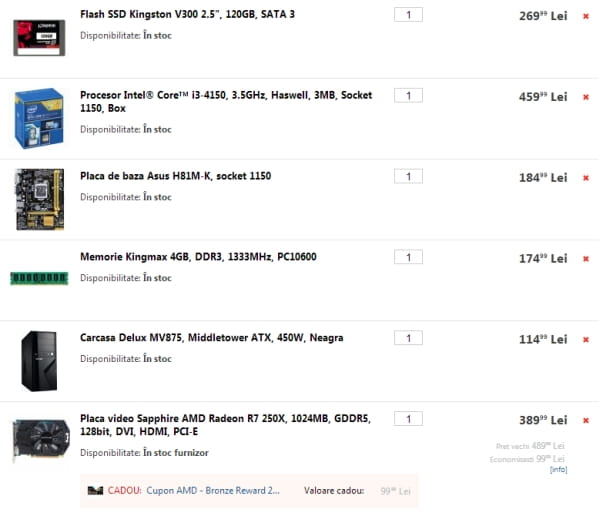 Ți-am făcut o configurație de 1600 RON, și merită cei 200 RON în plus pentru că ai un plus de 20% performanță în jocuri. Dacă vrei să iasă mai ieftin poți alege nVidia GeForce GT630 ca placă video dar o să pierzi la capitolul performanță.