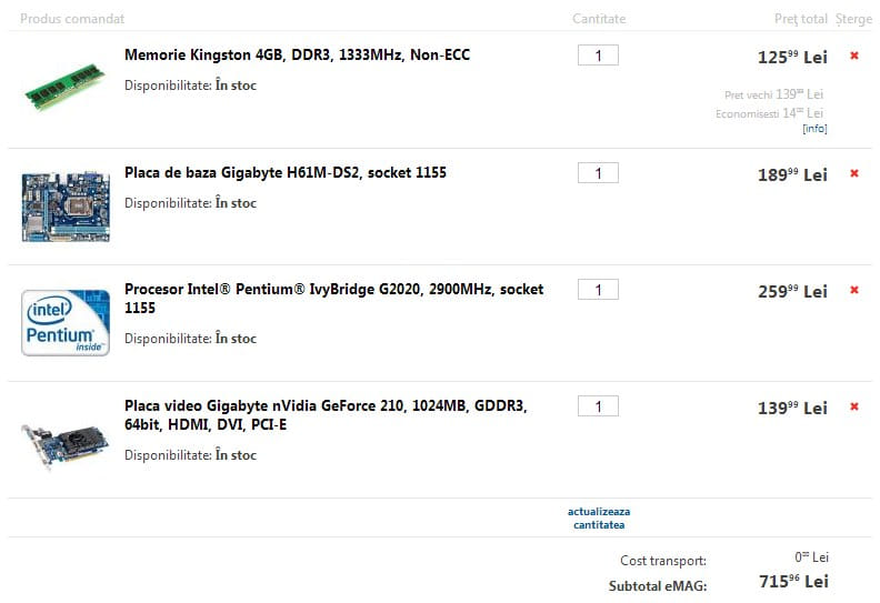Alexandru ce zici de unitatea urmatoare: placa de baza: INTEL H61 MSI H61M-P20; CPU: INTEL Ci3 I3-2120 3.30GHz 3MB BOX; MEM: DDR III 4GB 1333MHz Kingmax; HDD: 1TB WD 7200RPM S-ATA3 64MB; Video: asus N210 PCI-E 1GB DDR3 64BIT. Ii buna de ceva??